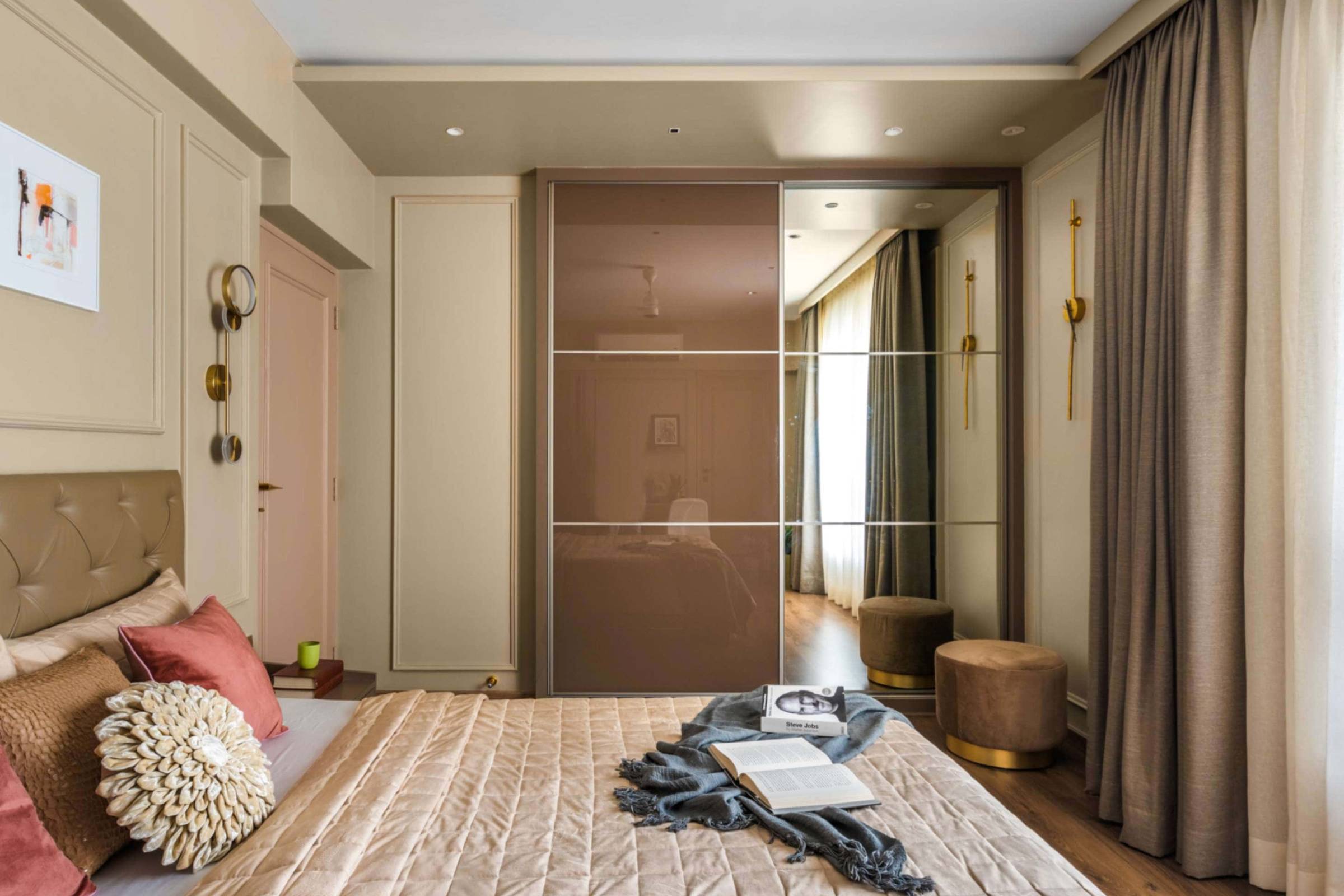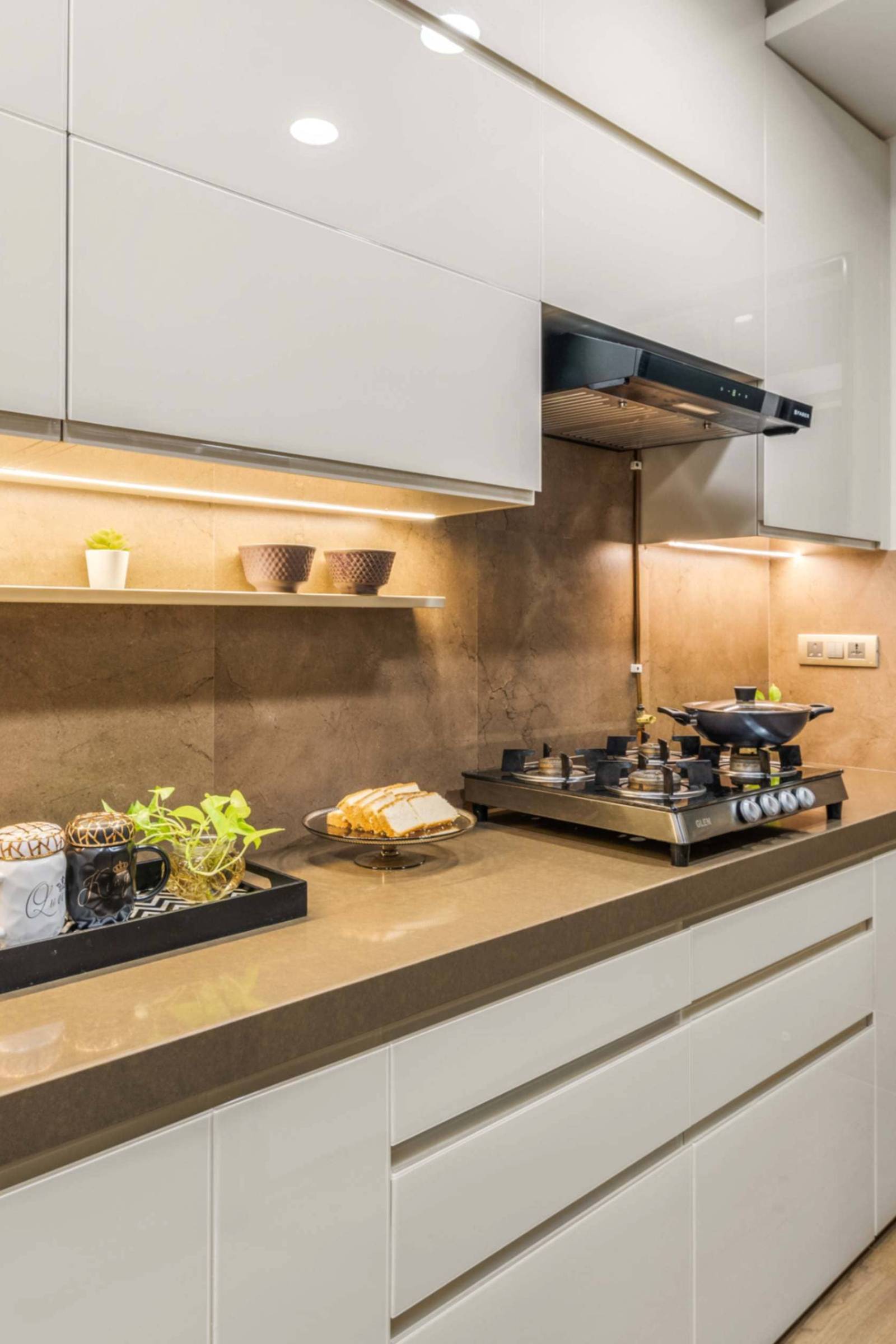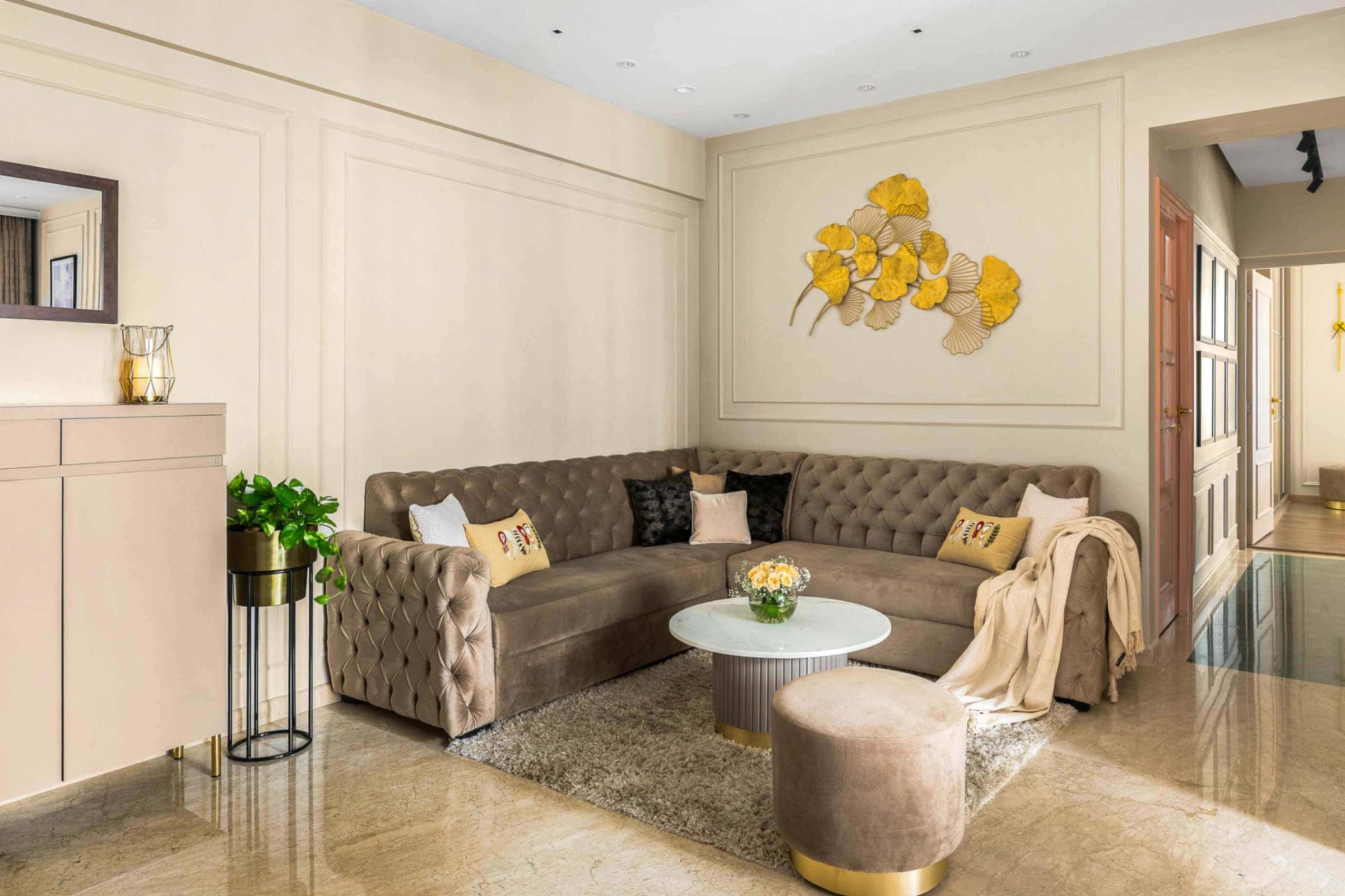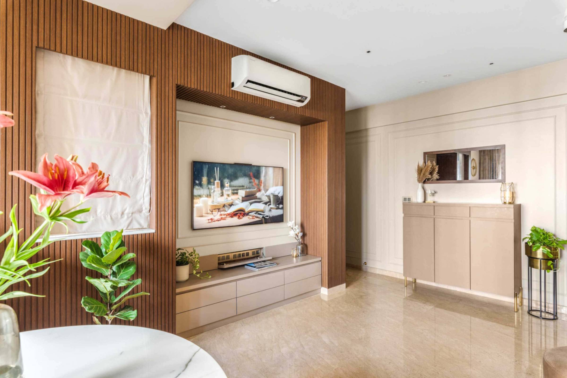 Located in Mayflower, Hiranandani meadows, Thane, this 850 sqft 2bhk residence is a thoughtfully designed beautiful apartment completed in 2022, where every element reflects the client’s clear vision for mood, material expression, and colour theme. The designers translated this clarity into a cohesive and refined interior, crafting a space that feels calm, personal, and intentional. Neutral tones—soothing beiges, soft greys, and warm whites—form the foundation of the palette, while a curated mix of textures and materials adds depth and visual interest. Despite its compact footprint, the home feels expansive and inviting, demonstrating how mindful curation and material harmony can elevate small-scale living with timeless elegance.